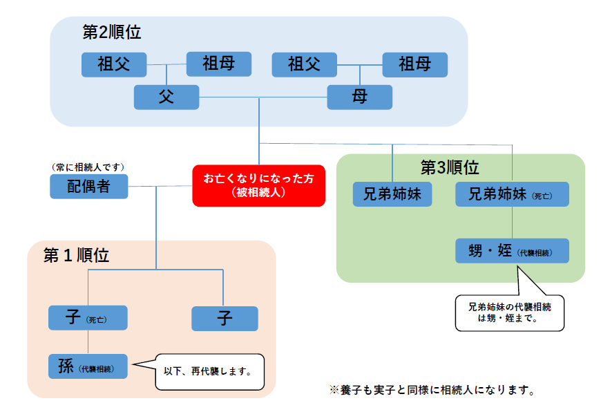 おり、同じ順位の相続人が複数いる場合は同順位の全員が相続人となります。法定相続人の範囲は「第1順位の範囲の相続人がいな