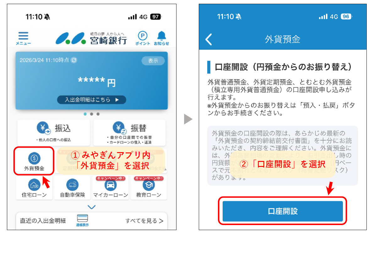 ・アプリからのお申し込みの場合は、お申込日時によって、適用相場・金利及び口座開設日・口座振替日が異なりますのでご注意