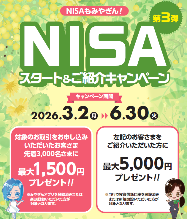 | 名称 | NISAもみやぎん!NISAスタート&ご紹介キャンペーン(第3弾) |